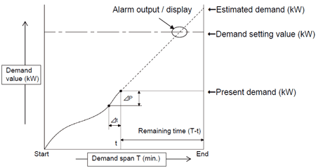 對于「簡易需求功能」,通過對30分鐘內平均電力的推算,判斷每1分鐘電力的功能。 不能對應脈沖輸入。只能對應CT輸入(電力測量)。 超過設定的需求目標值時,通過需求警報告知。