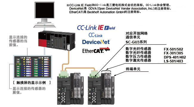 通過對應開放網絡的通信單元SC-GU3系列を可以連接至開放網絡CC-Link IE Field/CC-Link/DeviceNet/EtherCAT。PLC、電腦等監控儀器都可以進行連接設置。