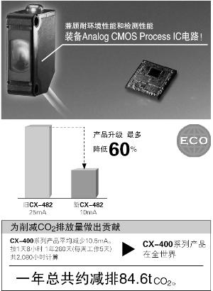 CX-400系列裝備新開發的定制IC電路,在提高環境適應性、檢測性能和可靠性方面做了種種改進,產 品陣容共計140種。產品升級,各機型平均降低功耗44%,最多者降耗達60%。為節能、減排CO2和保 護地球環境做出貢獻。 |