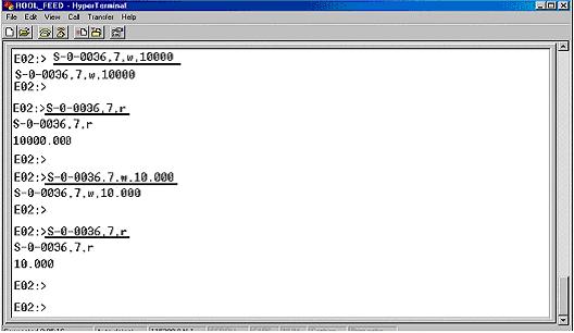 驅(qū)動器OPEN后,我們可以修改驅(qū)動器中的參數(shù)。例如我們通過超級終端讀寫速度命令值 (S-0-0036)如下: